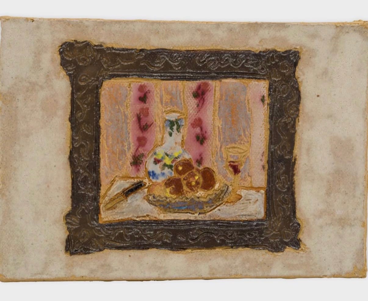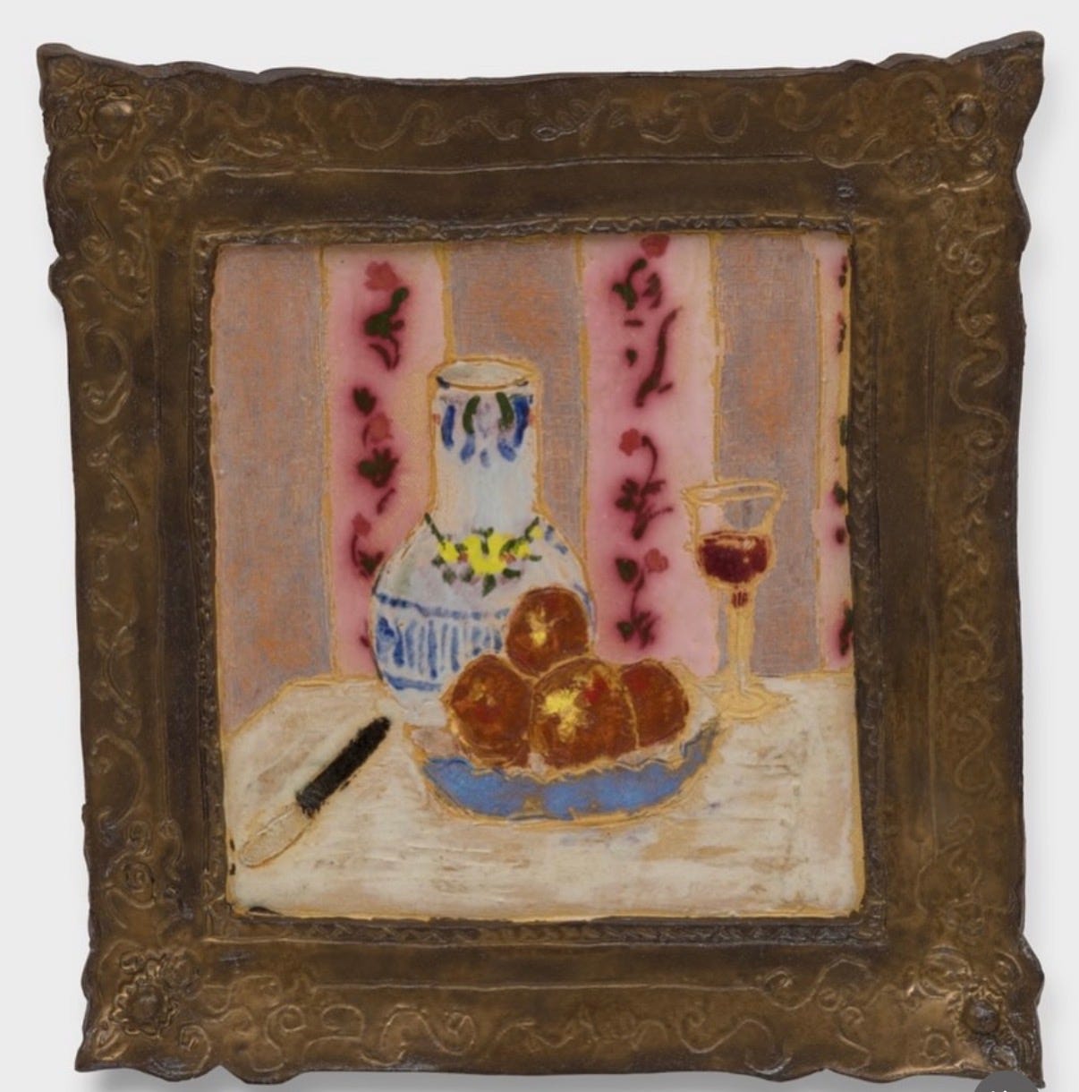 At Felix, she took that same concept somewhere new. This show was about paintings, works she had encountered at the Louvre, the Met, the Art Institute of Chicago, the Frick. She begins each piece the same way: a 4x6 ceramic postcard, a small glaze painting made from an iPhone photo taken at the museum. That postcard becomes a study, a place to work out color and glaze combinations before she moves to the larger work, a ceramic sculpture of the painting itself. They can masquerade as traditional paintings, she says, but they have the sheen and bodily presence that only ceramics carry. She calls them “ceramic sculptures of paintings,” and together they become a room that feels like a mini museum of her past year.